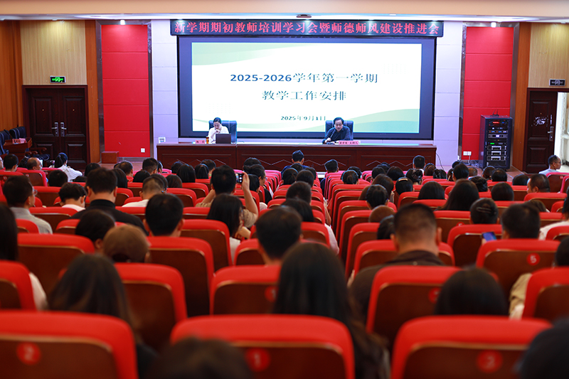 9月1日,我校在学术报告厅召开2025-2026学年第一学期期初教师培训暨师德师风建设推进会。党委副书记、校长李建伟出席会议并作讲话。党委委员、副校长梁学军主持会议。教务处全体工作人员,各教学业务单位党政负责人、分管教学副院长、教研室主任以上干部、各课程负责人以及近三年新引进教师共200余人参加会议。